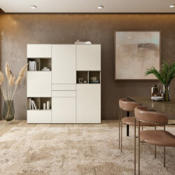 4 Deuren: De kast is uitgerust met vier deuren die toegang bieden tot verschillende compartimenten. Dit ontwerp maakt het eenvoudig om je spullen georganiseerd te houden, of het nu gaat om boeken, servies, of decoratieve objecten.