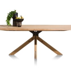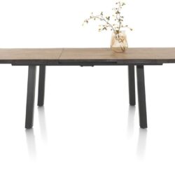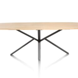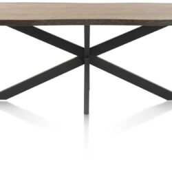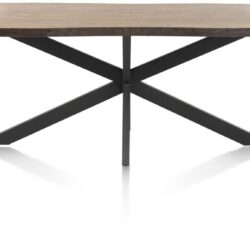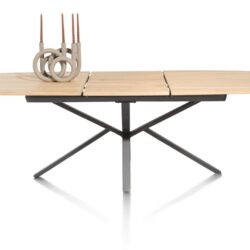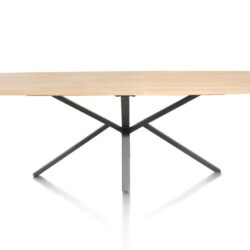 Het tafelblad bestaat uit massief eik dat geborsteld is, dit om de houtstructuur nog beter te laten uitkomen. Het onderstel is een X-poot in zwart metaal. Deze tafel bestaat ook nog in verlengbaar formaat op 220-320x98cm. Ook mogelijk als vaste eettafels of als salontafel.