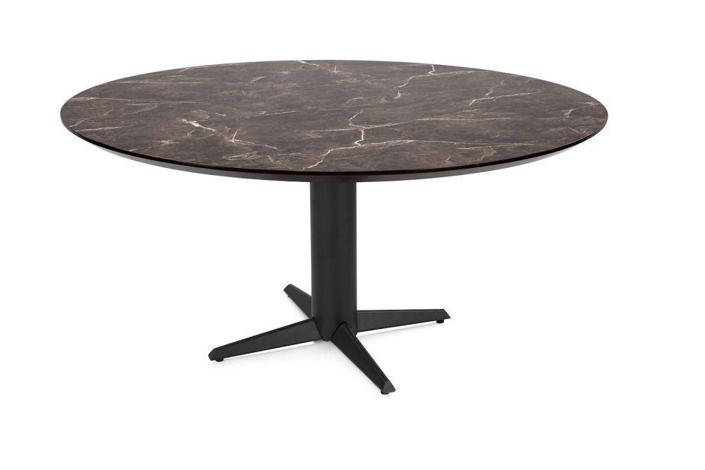 Caletta, eetkamertafel rond 150 cm. – HPL Primo Laminato blad – centrale teenpoot zwart – marble brown
