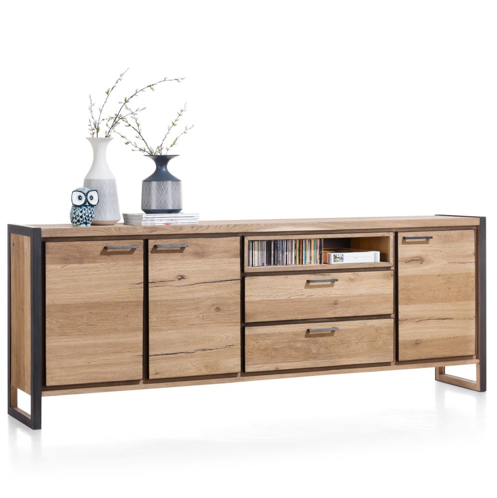 Dans la collection robuste Metalo de Henders & Hazel, vous trouverez divers buffets. Cette version dispose de 3 portes, 2 tiroirs et 1 niche. Ce qui est remarquable dans ce buffet moderne, ce sont les accents métalliques, tant dans les pieds qui se prolongent que dans les cadres autour des portes, des tiroirs et de la niche. Le buffet est fabriqué en placage de chêne et présente un beau grain naturel, caractéristique du chêne.
