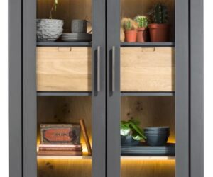 Les vitrines sont de superbes créateurs d’ambiance et des éléments accrocheurs dans l’intérieur. Cette vitrine moderne de la collection Livada en est un bon exemple. La vitrine est fabriquée en placage de chêne sauvage et finie en couleur Natural. L’intérieur de l’armoire a une belle couleur anthracite. L’éclairage LED intégré est très agréable. Les tiroirs dans la vitrine sont pratiques, car il y a toujours des objets que vous ne voulez pas garder à la vue. La vitrine mesure 100 cm de large, 200 cm de haut et est disponible en 4 couleurs.