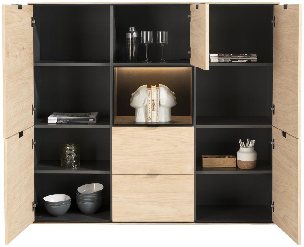 Une nouveauté pour votre séjour : cette dressette ELEMENTS, disponible aussi bien dans cette belle teinte naturelle qu’en onyx. Cette merveille en chêne plaqué possède 5 portes, 2 tiroirs et une niche avec éclairage LED. En d’autres termes, un vaste espace de rangement et la possiblité de mettre vos plus beaux objets en lumière. La façon dont vous allez la disposer dans votre séjour vous revient : directement sur le sol, sur des pieds design ou sur un élégant plateau ?