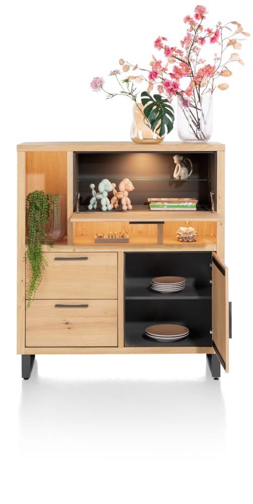 Ce highboard de la collection Pavie de Henders & Hazel se décline en deux coloris différents : castle black industriel et couleur bois naturel. Cette version trouve le mieux sa place dans un intérieur naturel. Ce meuble est polyvalent ; il peut aussi bien être utilisé comme armoire indépendante que comme espace télétravail avec ses clapets situées à l’avant. En outre, ce meuble compte deux tiroirs, une grande porte dotée d’une structure en lattes et 3 compartiments ouverts pour exposer de la décoration ou de petits objets. Pour les armoires de cette collection, vous avez le choix entre une armoire sur des pieds en métal ou une armoire placée directement contre la plinthe.