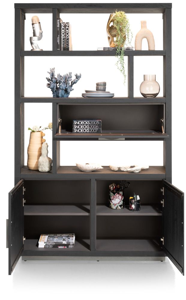 La collection Pavie de Henders & Hazel propose 3 armoires différentes. Chacune d’elles à ses propres caractéristiques. Voici la version la plus grande (125 cm de large) : elle compte deux armoires spacieuses avec portes en bas, une porte à clapet qui s’ouvre horizontalement au milieu, et sur la partie supérieure, 6 grands compartiments ouverts pour votre décoration. Ces armoires existent avec ou sans pieds. En effet, elles peuvent aussi se placer directement contre la plinthe, pour un effet solide et robuste. Enfin, ces armoires se déclinent en deux variantes : Castle black et couleur bois naturel. Cette version est en Castle Black.