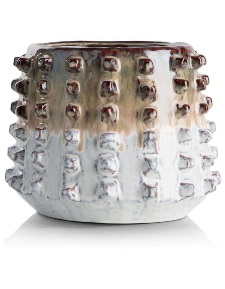 Rien de tel que le cache-pot SAAR pour apporter une touche spéciale dans votre maison. Fabriqué en céramique, ce cache-pot imperméable est émaillé de ‘piquants’ amusants à l’extérieur. Ce motif irrégulier et le dégradé de couleurs sur la couche de vernis confèrent un style artisanal au pot. Ce qui n’est pas si dénué de sens, car finalement, c’est la cuisson dans le four à céramique qui détermine l’apparence du pot. Chaque pot SAAR est donc réellement unique ! Celui-ci mesure 19 cm de haut, mais notre collection COCOmaison en propose un autre de 22 cm.
