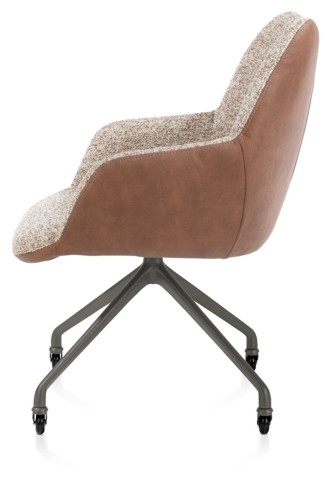 Mats, chaise à accoudoirs – piétement aluminium graphite + roulettes – Pala cognac + Luton cuivre