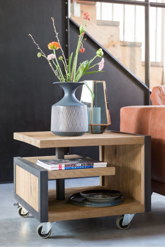Deze stoere salontafel uit de Metalo collectie van Henders & Hazel past goed in een eigentijds interieur. Dankzij de combinatie van eikenhoutfineer en metalen details heeft de salontafel een robuust uiterlijk. Het opvallende design geeft de tafel een moderne look. Handig zijn de wieltjes onder de salontafel waardoor deze makkelijk is te verplaatsen.