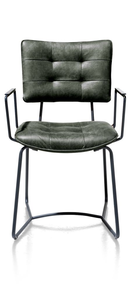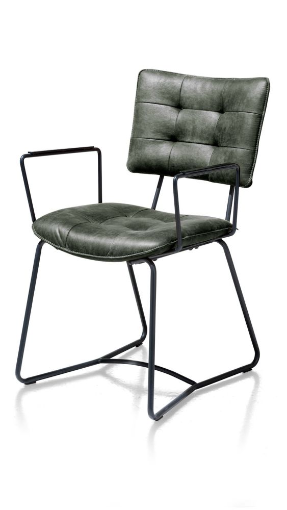Deze stoere moderne armstoel Julien heeft een fraai tijdloos design en is bekleed met groen Corsica microleder. Het metalen frame in de kleur rough off black en de stiknaden en de gecapitoneerde rugleuning en zitting geven deze armstoel een geheel eigen karakter. Julien is in meerdere soorten en kleuren leverbaar en kun je dus prima met elkaar combineren.