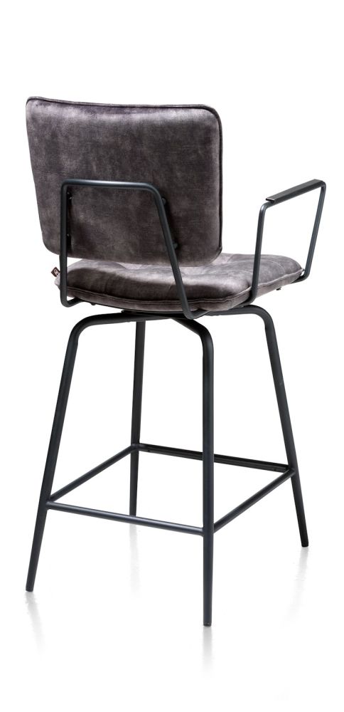 Deze eigentijdse barstoel Manou is voorzien van handige armleuningen. Er is zowel een variant met als zonder armleuningen verkrijgbaar. De barstoel is 102 cm hoog en heeft een metalen frame in de kleur off black. Fraaie blikvangers zijn de gecapitonneerde rugleuning en zitting van de barstoel. De barstoel is bekleed met de microvezelstof Karese in de kleur antraciet. Deze stof heeft de uitstraling van velvet, warm en zacht, maar kan tegelijk goed tegen een stootje. Ideaal voor intensief gebruik dus.