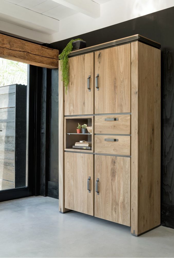 Deze robuuste houten bergkast uit de Farmland collectie van Henders & Hazel biedt enorm veel bergruimte. De kast met een stoer eigentijds design is gemaakt van eikenhout en eikenfineer en afgewerkt in de kleur Railway Brown. De bergkast heeft 4 deuren, 2 laden en 2 niches waarin ledverlichting is verwerkt. De metalen accenten van de kast geven de kast een subtiel industrieel tintje, maar behoudt wel een overwegend landelijk karakter.