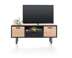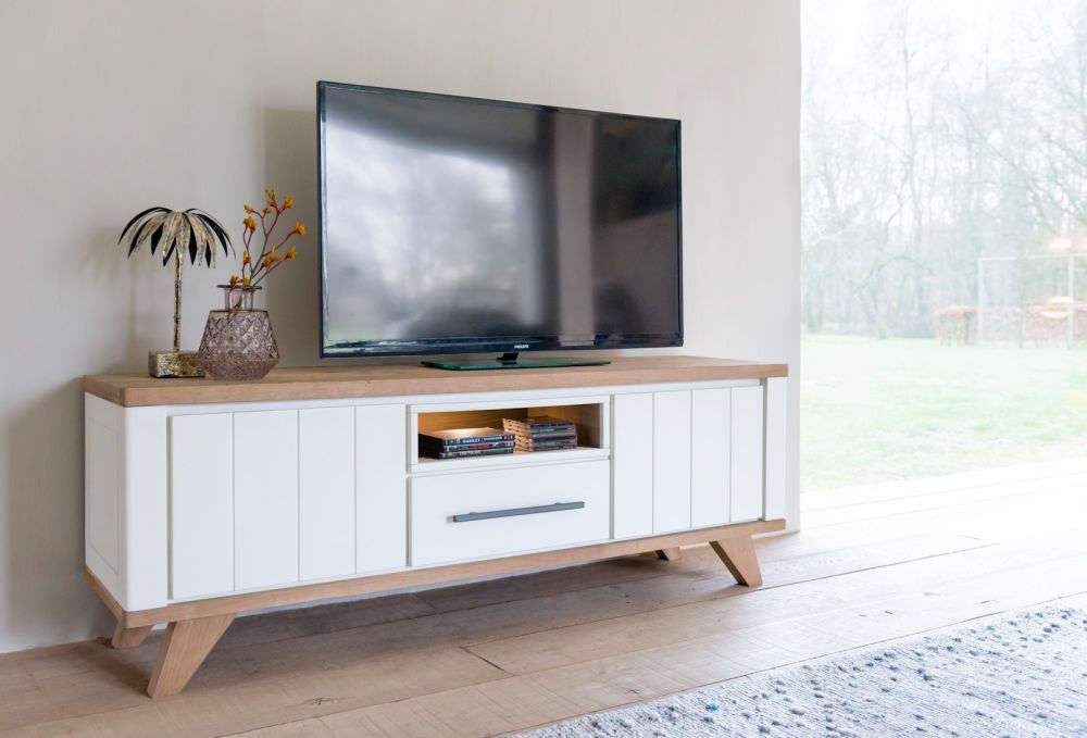 Dit royale lowboard is afkomstig uit de Jardin collectie van Henders & Hazel en heeft een modern landelijke uitstraling. Het lowboard is maar liefst 210 cm breed, heeft 1 lade, 1 niche, 2 kleppen en geïntegreerde ledverlichting. Door eikenfineer in de kleur Railway Brown te combineren met MDF delen in de kleur Pure White heeft dit meubel een eigentijdse frisse look die goed past in een landelijk interieur.