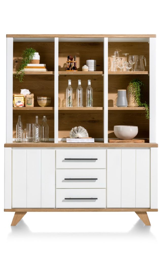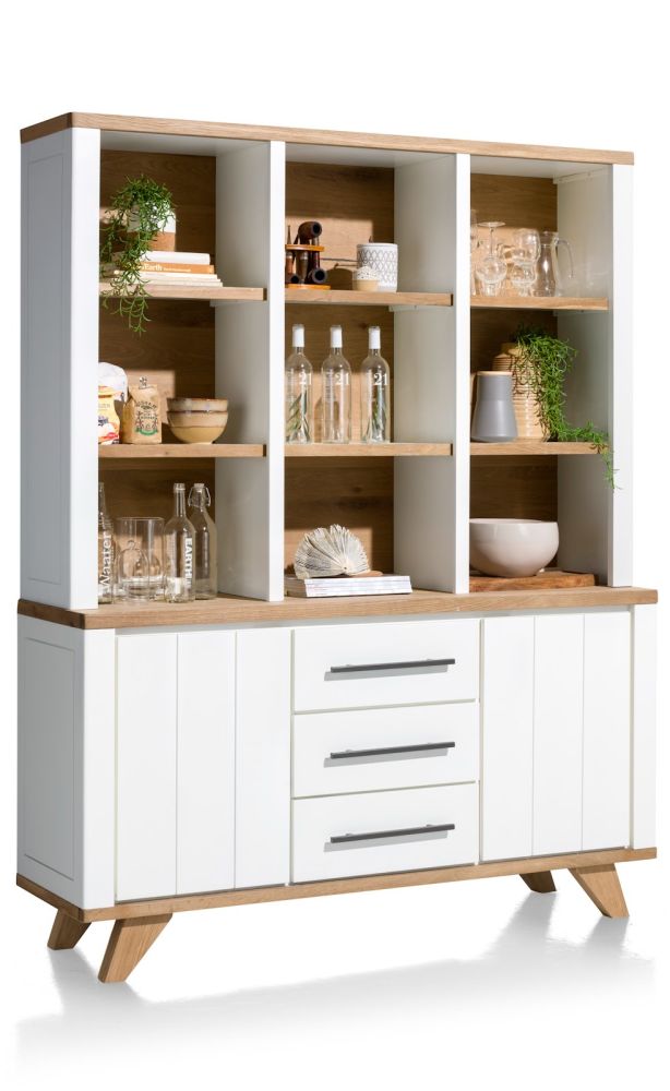 Kenmerkend voor de Jardin collectie van Henders & Hazel is de moderne landelijke uitstraling. Deze royale buffetkast is daar een fraai voorbeeld van. De buffetkast is 160 cm breed en 200 cm hoog. Onderin vind je 2 kastendeuren 3 laden. Bovenin heb je 9 niches om spullen in uit te stallen. De buffetkast is gemaakt van eikenfineer in de kleur Railway Brown, gecombineerd met MDF in de kleur Pure White. Een mooie buffetkast die perfect past in een eigentijds landelijk interieur.