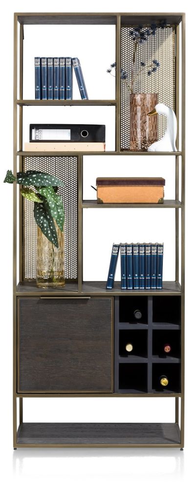 Deze modern industriële boekenkast uit de City collectie is een stoere blikvanger in het interieur. De boekenkast is gemaakt van eikenfineer in de kleur Castle Antraciet in combinatie met goudkleurig metaal. Opvallend is het lijnenspel van deze kast, die bestaat uit 1 deur, 6 niches en 6 wijnrekken. De kast is ook leverbaar in kleur Railway Brown met zwartkleurig metaal.
