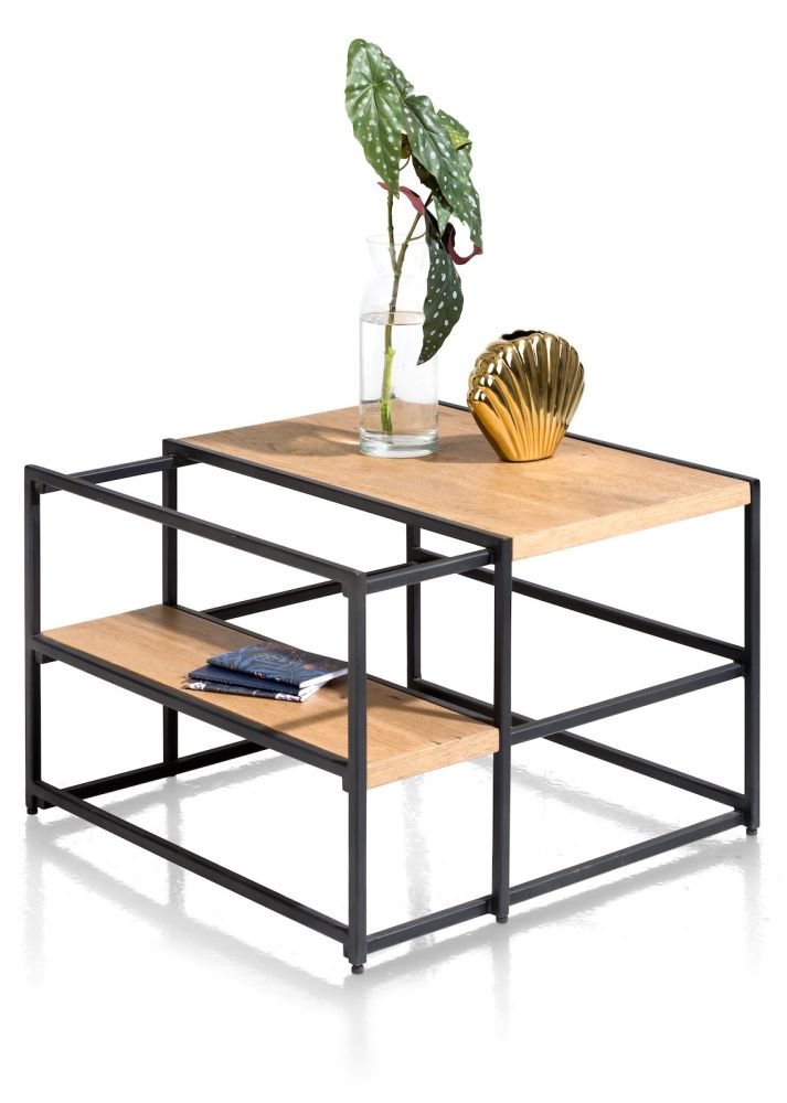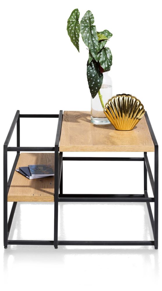 Deze moderne vierkante bijzettafel uit de City collectie is gemaakt van eikenfineer in de kleur Railway Brown en zwart metaal. Het tafeltje heeft een opvallend industrieel design. Extra leuk is dat de tafelbladen los in het frame liggen. Je kunt zo vrij eenvoudig het uiterlijk van het bijzettafeltje aanpassen door de planken te verleggen.