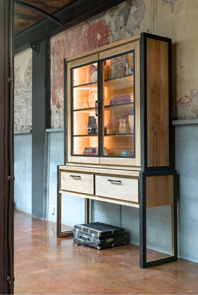 Deze industriële buffetkast uit de Metalo collectie is echt een gave blikvanger in het interieur. De kast is 140 cm breed en 200 cm hoog. Het bovenste deel heeft 2 royale glasdeuren waarachter een warm ledlicht schijnt. Het onderste deel heeft 2 fijne laden. De buffetkast is gemaakt van eikenfineer in de kleur Railway Brown en voorzien van stoere metalen accenten.