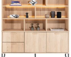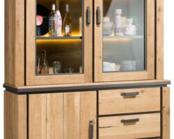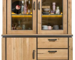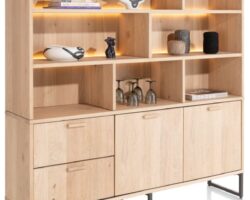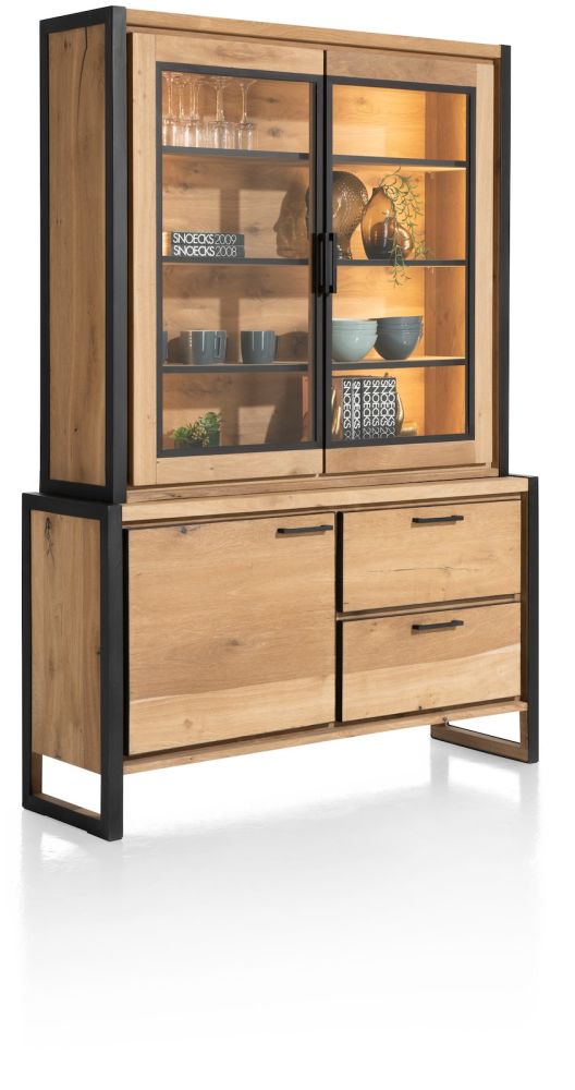 Hoe tof is deze moderne buffetkast met rustieke uitstraling uit de Metalo-collectie. De buffetkast, gemaakt van eikenfineer, heeft een eigentijds design. Het eikenfineer is vrijwel niet van massief hout te onderscheiden en afgwerkt in de kleur railway brown. Stoer zijn de metalen accenten in de kleur desert black. De buffetkast heeft 2 glasdeuren, 1 deur en 2 laden. De ledverlichting achter de glasdeuren zet fraai servies of woondecoraties in de spotlight.