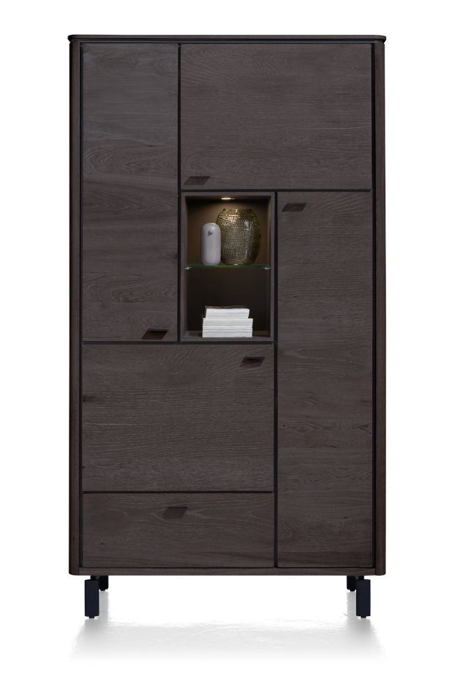 Zoek je een moderne bergkast met strakke lijnen en voldoende bergruimte? Dan is deze bergkast uit de Livada collectie een aanrader. De kast is gemaakt van wild eikenfineer en afgewerkt in de opvallende kleur Onyx. Achter de 4 deuren en in de lade is een zee aan bergruimte te vinden. De 2 niches, voorzien van warm ledlicht zijn ideaal om wat leuke woondecoraties in uit te stallen. De kast is 110 cm breed en 200 cm hoog.