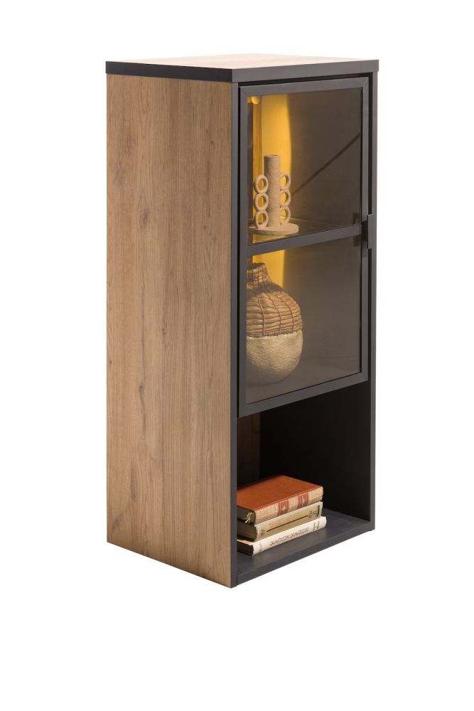 Dit is zo’n fijn element dat je eigenlijk overal wel kwijt kunt. Je kunt het neerzetten of ophangen. Het element uit de Avalon collectie is 98 cm hoog, heeft 1 glasdeur met 2 vakken en 1 extra vak. Opvallend is de manier waarom het geïntegreerde ledlicht schijnt: dit zorgt voor een opvallend en sfeervol lichteffect. Het element is gemaakt van Primo Laminato in de kleur oak natural vintage.