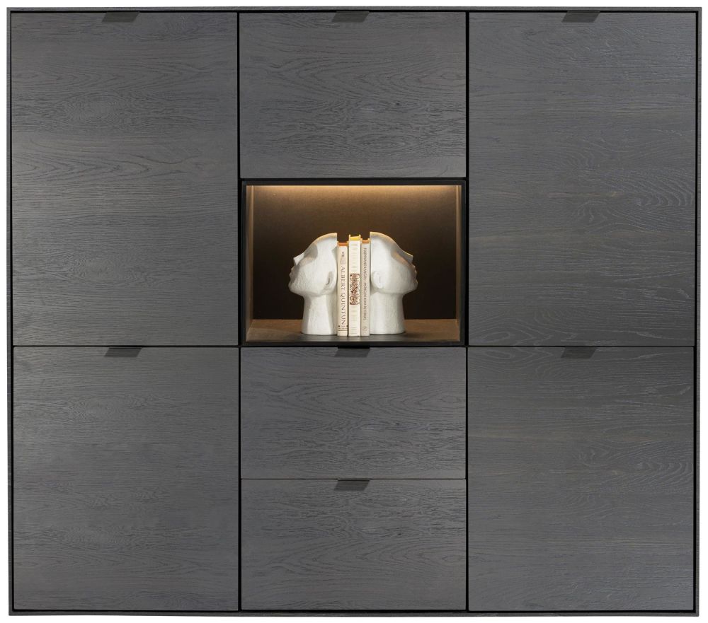 Zie jij ‘m al staan in je woonkamer of keuken, dit prachtige eiken fineer dressette ELEMENTS in de kleur onyx? Het dressette is voorzien van 5 deuren, 2 lades en 1 niche dat met led kan worden verlicht. Er zijn verschillende opties mogelijk om ELEMENTS in je interieur te plaatsen: direct op de grond, op designpoten of op een stijlvol plateau. Het dressette heeft een afmeting van 150 x 133 cm en is ook verkrijgbaar in de kleur naturel.