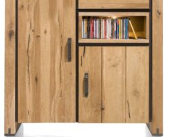 Dit highboard uit de collectie Homestead is geschikt om te gebruiken als home office, maar is ook een perfect barmeubel door de horizontale klep. Daarnaast heeft dit meubel met Scandinavische look ook nog 3 deuren en bovenaan 3 handige kleine open vakken, die op hun beurt worden verlicht door ledverlichting. Het meubel is 125cm breed en 140cm hoog. Niet te groot, maar ook zeker niet te klein! Een prachtige toevoeging aan een natuurlijk en fris interieur.