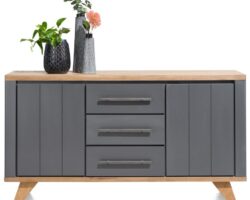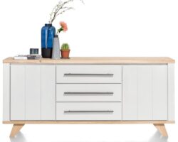 Hoe mooi is dit retro dressoir ARAMON dat is geïnspireerd op klassiek design uit de eerste helft van de 20e eeuw? Het bovenblad is uitgevoerd in duurzaam HPL met een zwarte marmerlook. ARAMON is 210 cm breed en voorzien van 2 deuren, 2 glasdeuren van smokey glas en 3 niches die met led zijn verlicht. De afgeronde zijpanelen, deuren en lades zijn afgewerkt in eigentijds melanine met een verticale lattenstructuur. De fijne kegelvormige poten geven het dressoir zijn verrassende luchtigheid.