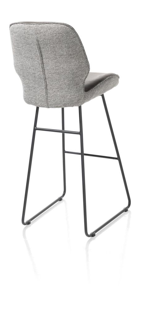 De barstoelen uit collectie Ravi zijn verkrijgbaar in twee hoogtes: een normale barstoel van 98cm hoog met een zitting van 67cm hoog en een extra hoge versie van 114cm hoog met een zitting van 82cm hoog. Dit is de extra hoge versie. De barstoel heeft een modern design met een versmalling in de rug en is uitgevoerd in twee stoffen: vooraan lederlook Secilia en achteraan chenillestof Toba. Deze versie is uitgevoerd in het kleurthema antraciet/grijs.