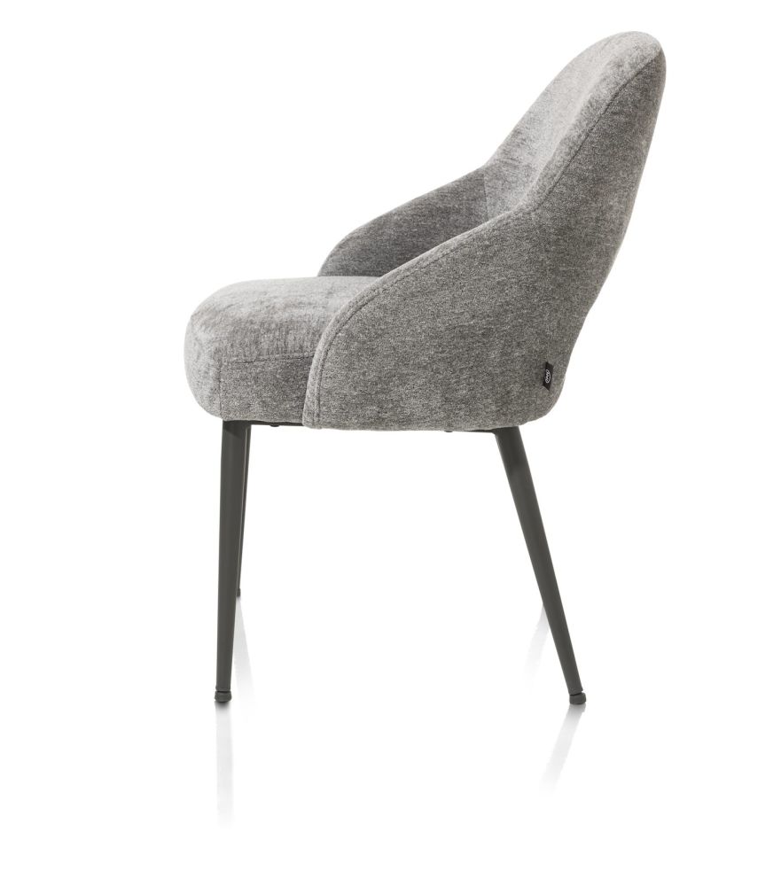 Deze stoel Nikolas uit de Henders & Hazel collectie heeft een speels, open design dat over heel de stoel doorloopt. De stoel is bekleed met stof Enzo, een chenillestof met verschillende kleurtinten die mooi door elkaar geweven zijn. Deze versie is uitgevoerd in kleur grijs, maar er zijn ook nog 3 andere zachte kleurtinten verkrijgbaar! Deze versie van de stoel is uitgevoerd met 4 vaste poten in de kleur grafiet, maar er is ook een draaibare versie beschikbaar met automatische terugdraaifunctie.