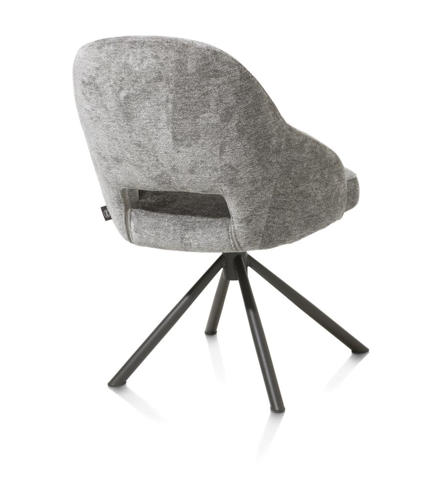 Deze stoel Nikolas uit de Henders & Hazel collectie heeft een speels, open design dat over heel de stoel doorloopt. De stoel is bekleed met stof Enzo, een chenillestof met verschillende kleurtinten die mooi door elkaar geweven zijn. Deze versie is uitgevoerd in kleur grijs, maar er zijn ook nog 3 andere zachte kleurtinten verkrijgbaar! Deze versie van de stoel is uitgevoerd als draaibare versie met automatische terugdraaifunctie, maar er is ook een versie met 4 vaste poten in de kleur grafiet.