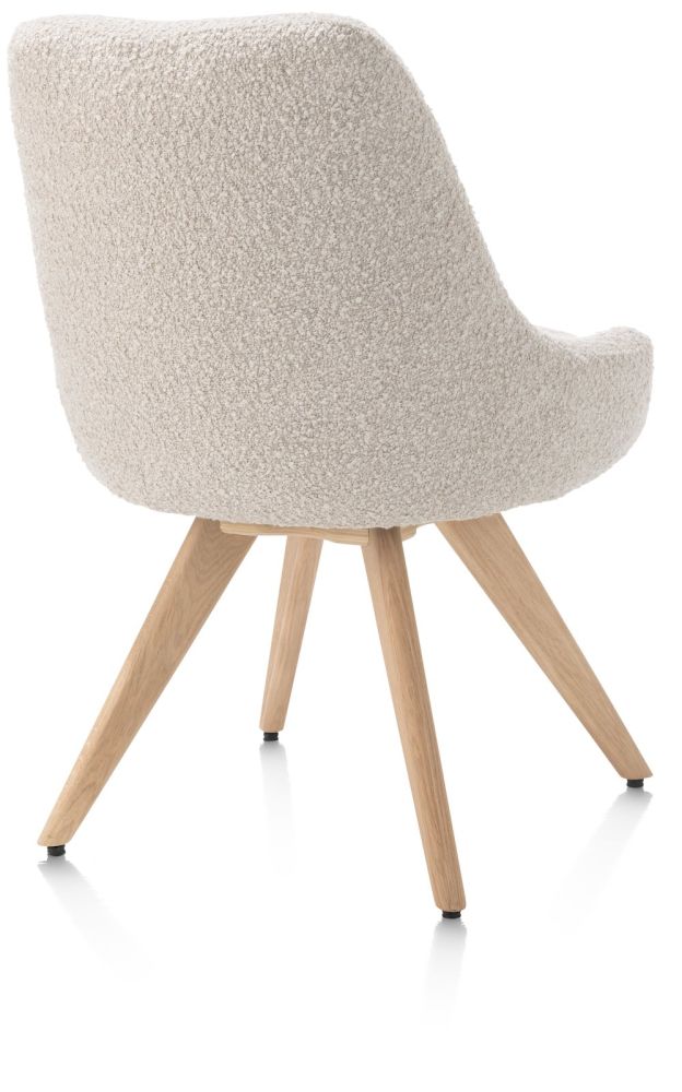 Deze draaibare eetkamerstoel Rocco heeft een lekker brede kuip en heeft 4 natuurlijke eikenhouten poten. Daarnaast heb je ook de keuze uit een 4 poten in de kleur grafiet. De stoel is eveneens verkrijgbaar als draaibare armstoel. De zithoogte van deze stoel is 50cm en de stoel is uitgevoerd in de trendy lusjesstof (bouclé) Brioni. De stoel is verkrijgbaar in twee kleuren. Hier zien we de versie in de kleur crème.