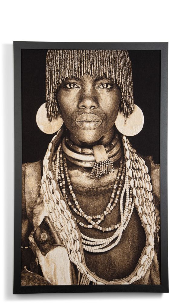 Ontdek de betovering van het Hamar Woman schilderij uit de exclusieve wanddecoratie serie van COCOmaison! Dit schilderij van Mario Gerth komt uit de Gobelins serie. Met zijn imposante afmetingen van 125 x 75 cm is dit luxe kunstwerk een absolute eyecatcher in elk interieur. Het geweven doek geeft diepte aan het schilderij. De dikke houten lijst maakt het geheel helemaal af en hierdoor komt het kunstwerk echt tot leven. Dit schilderij past perfect in een industriële stijl, maar is ook mooi te combineren met andere stijlen. Breng wat verfijning in huis en laat dit meesterwerk je ruimte transformeren. Dit schilderij is op zichzelf al prachtig, maar laat zicht ook perfect combineren met het Samburu Warrior schilderij uit dezelfde serie.