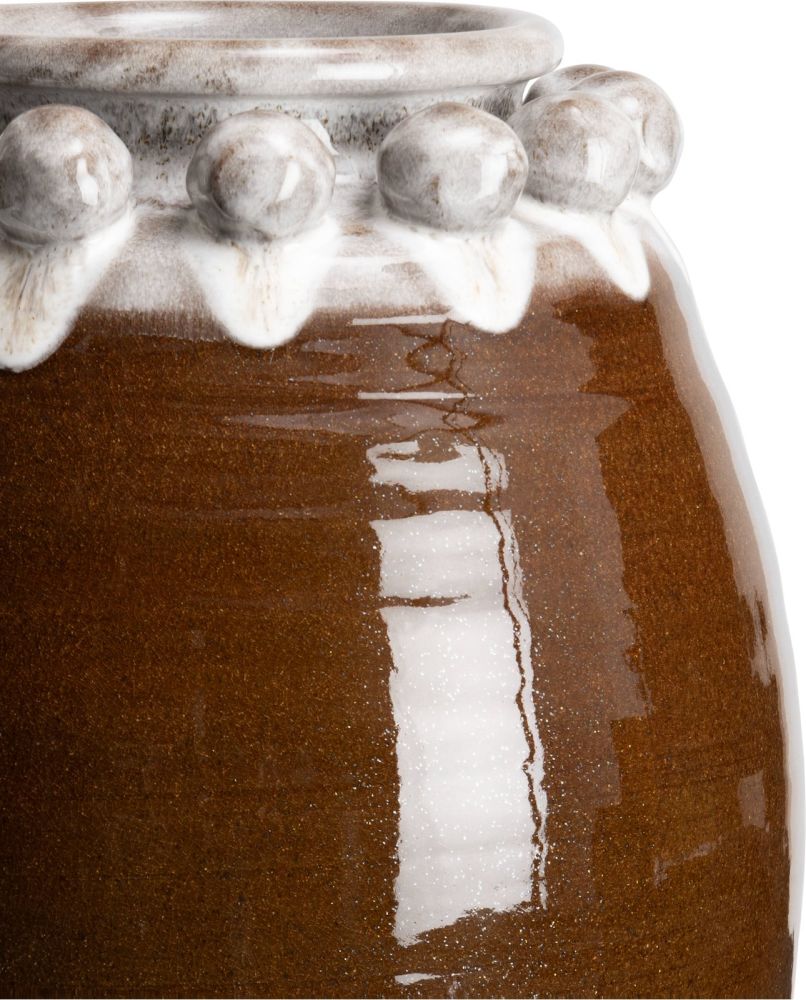 Als je op zoek bent naar een stijlvolle keramieken vaas, is vaas Nera echt iets voor jou. Elke vaas heeft een uniek diepbruin glazuur met een sierlijk motief in het wit/grijs. Een leuk detail zijn de mooie bolletjes aan de hals, die de vaas net dat beetje extra geven. Nera is 31 cm hoog en is gemaakt van 100% keramiek. Op zoek naar een item om deze vaas mee te combineren? In deze serie van COCOmaison zit ook nog een schaal en een andere vaas.