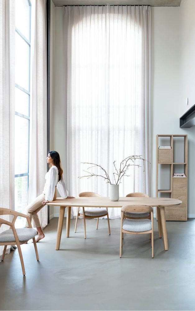 Eetkamertafel ODDA leent zich uitstekend voor lange avonden tafelen. Hij heeft een afmeting van 230 x 110 cm en is geliefd vanwege zijn natuurlijke, stoere uitstraling, inclusief zichtbare houtnerven en knoesten. ODDA heeft een Deens ovalen blad van massief eikenhout en staat op schuine tafelpoten. Samen met de afgeronde randen van het blad zorgen de poten voor een luchtig effect. ODDA komt goed tot zijn recht in verschillende woonstijlen. De kleur van jouw eetkamertafel kies je zelf: ga je voor naturel of onyx?