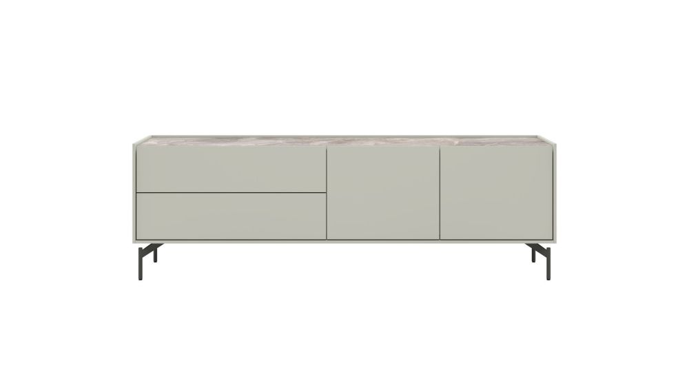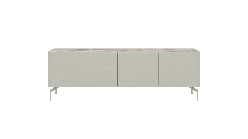 Noon, lowboard 170 cm – 2-deuren + 2-laden – bovenblad in HPL light grey