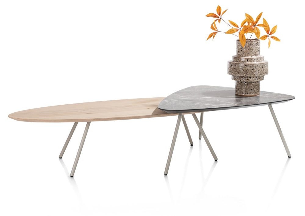 Dit is NIORA; een prachtige minimalistische salontafel met een mooie natuurlijke look. Het organisch gevormde blad is gemaakt van eikenfineer. De salontafel heeft een afmeting van 150 x 50 cm en staat op een rank metalen onderstel dat verkrijgbaar is in 2 kleuren: silk grey of grafiet. Liever een blad met een iets luxere uitstraling? NIORA is ook verkrijgbaar met een licht grijs blad, gemaakt van Primo Laminato (HPL) met marmerlook. De salontafel is er ook in een maat kleiner. Zie jij deze elegante eyecatcher al in je woonkamer staan? Tip: je shopt NIORA ook als eetkamertafel.