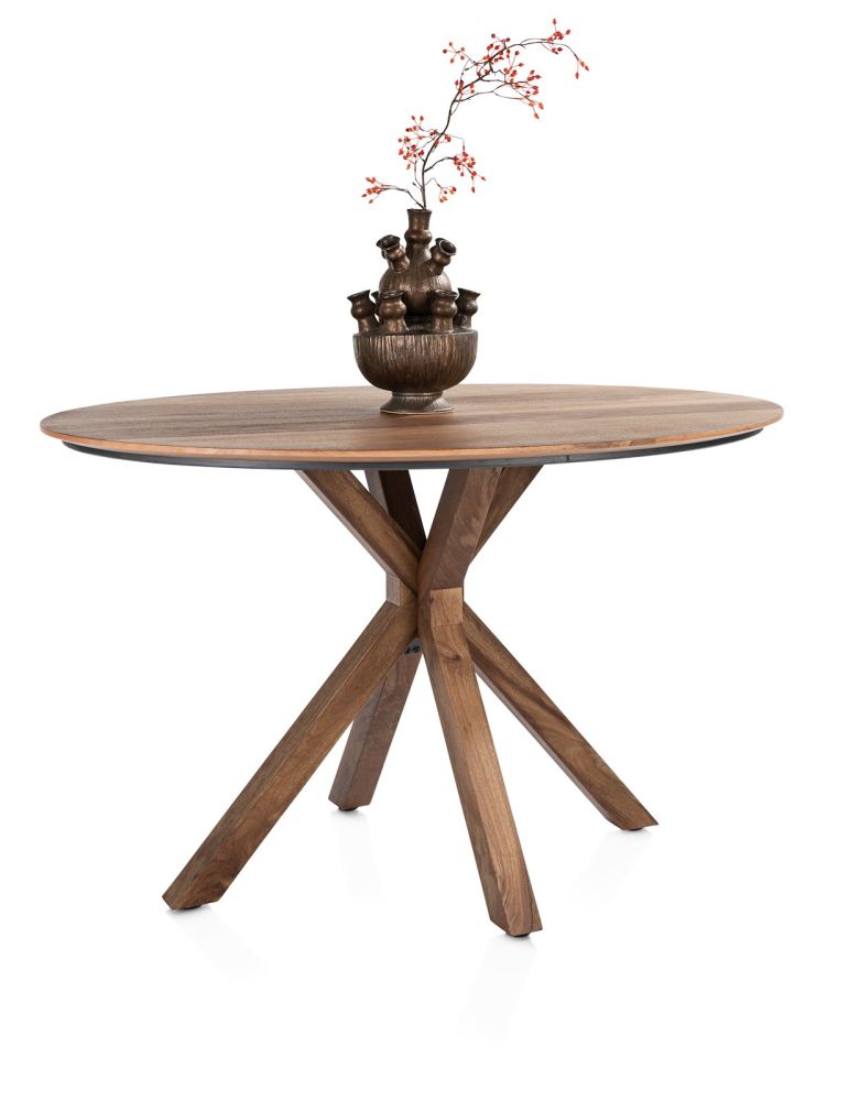 Natuurlijk mag ook een bartafel niet ontbreken in de Trapani-collectie Net als de eettafels heeft een centrale massief houten poot, maar het bovenblad van deze tafel is rond, met een doorsnede van 150cm. Je kunt er dan ook minimaal 6 barstoelen om kwijt. Alle Trapani eetkamertafels zijn gemaakt van smoked mangiferafineer, en afgewerkt met een laklaag voor een subtiele glans en extra vlek- en krasbestendigheid.