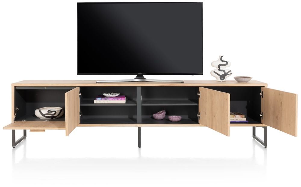De Scandinavische look is kenmerkend voor collectie Castello. Door het gebruik van licht eikenhout in de kleur sand oak krijgt de collectie een hele natuurlijke, pure uitstraling. Deze collectie heeft 3 praktische lowboards in verschillende maten. Dit is het grootste lowboard van 240cm breed en 60cm hoog. De lowboards zijn allemaal exact even hoog. Zo kun je als het ware bouwen aan een lange TV-meubelwand. De deuren van de alle kasten zijn uitgerust met houten grepen en staan op metalen poten in de kleur grafiet. Alle kastdeuren zijn voorzien van een soft-closing systeem. Daarnaast zijn de lowboards voorzien van een handig kabelopbergsysteem.