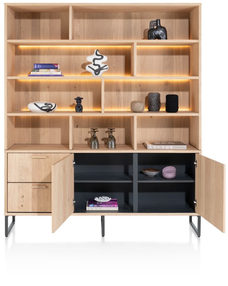 Deze buffetkast Castello heeft een open en modern Scandinavisch design. Grote open vakken, subtiele ledverlichting en voldoende opbergruimte onderaan maken van deze buffetkast een meubel dat echt kan scoren in jouw interieur. De frisse lichte houtkleur sand oak draagt bij aan de Scandinavische look van deze eikenhouten collectie. De buffetkast heeft 9 open vakken en 2 ruime kastdeuren en 2 lades onderaan. Er zijn 3 formaten buffetkast in deze collectie met elks een variërende breedte en hoogte. Deze versie is 181cm breed en 195cm hoog.