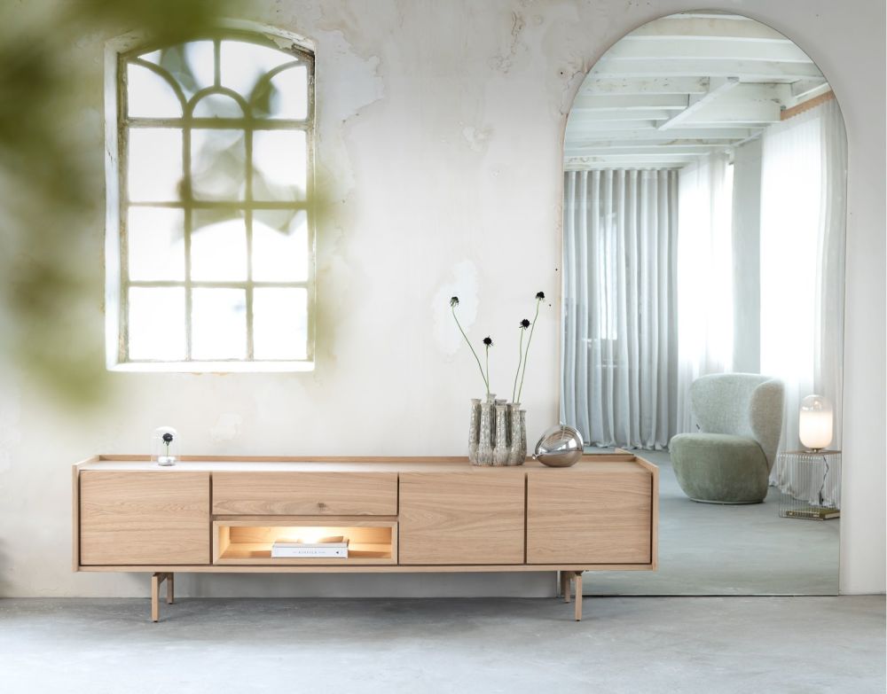 Ben je op zoek naar een strak vormgegeven lowboard met veel opbergruimte? Laat je verrassen door VALGARD; een lowboard met een natuurlijke uitstraling, gemaakt van naturelkleur eikenfineer. VALGARD heeft een onderstel in naturelkleur hout en is 220 cm breed. Het heeft 3-deuren + 1-lade + 1-niche met ledverlichting. De greeploze deuren en de lade met soft close systeem geven VALGARD zijn strakke, minimalistische uitstraling. Wist je dat de VALGARD serie ook andere mooie kasten bevat? VALGARD komt prachtig tot zijn recht in combinatie met bijpassende tafelcollecties: COSENZA en PALMA.