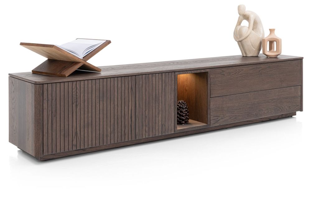 Aan opbergruimte geen gebrek met lowboard TRENTON dankzij 2-deuren + 2-laden + 1-niche. TRENTON is een prachtig eigentijds lowboard met vriendelijke, ronde vormen. Het is vervaardigd van eikenfineer in de kleur clay, wat zorgt voor net dat beetje pit in je interieur. Een gefreesd latjesmotief geeft TRENTON zijn unieke look. De deuren en laden zijn voorzien van een push to open systeem. Het lowboard rust op een stevig metalen onderstel in de kleur grafiet. Laat je verrassen door de andere uitvoeringen waarin TRENTON verkrijgbaar is.