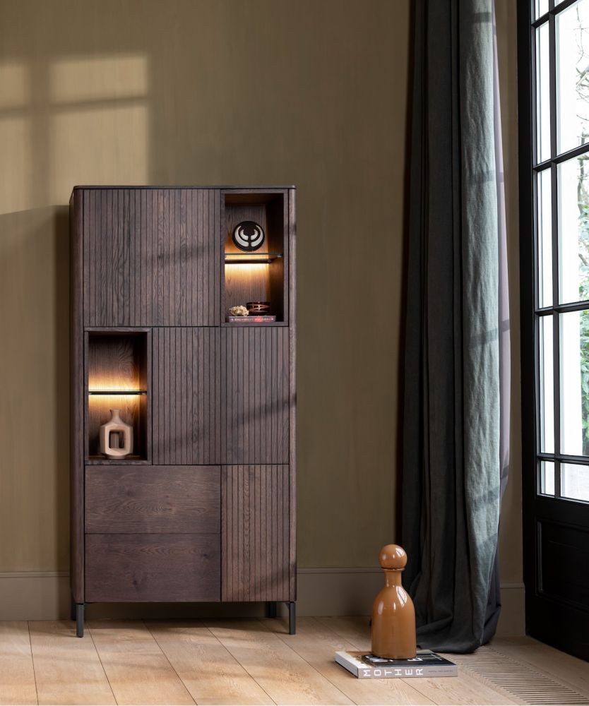 Will jij graag in stijl je spullen opbergen? Kijk dan eens naar deze bergkast uit de TRENTON serie van XOOON. De bergkast heeft een speels latjesmotief en is vervaardigd van eikenfineer in de kleur clay. TRENTON beschikt over 3-deuren + 2-laden + 4-niches en is voorzien van een praktisch push to open systeem. Dankzij de ledverlichting in de niches kun je je mooiste accessoires extra laten shinen. Het dressette staat op een grafietkleurig onderstel van metaal. Je shopt hem ook in de kleur naturel.