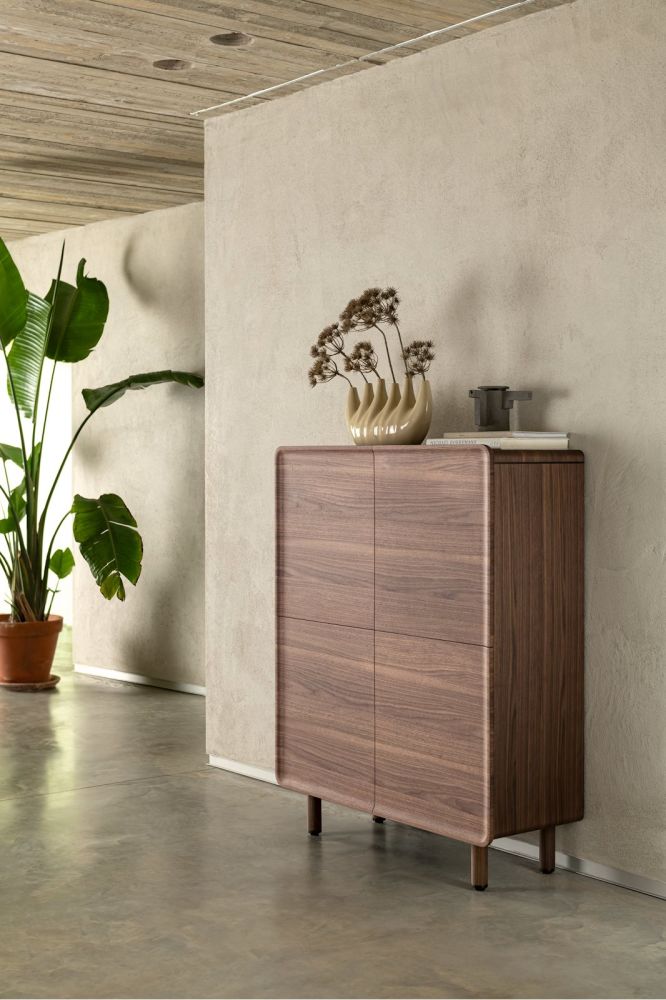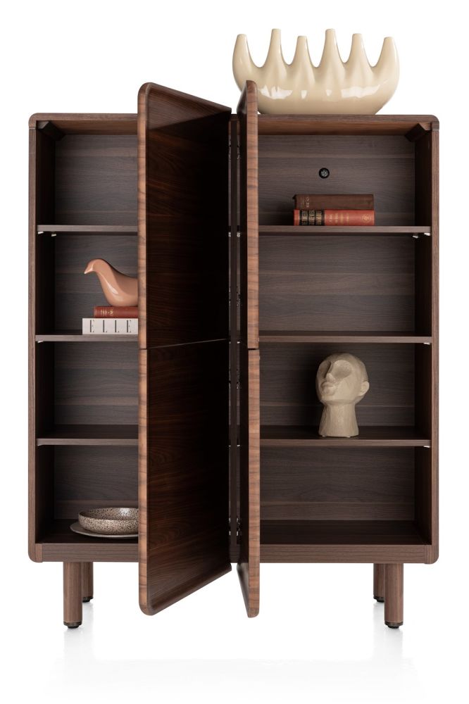 De BRIANZA bergkast is een elegante opberger die perfect past in een modern interieur. Het meubel is afgewerkt in gelakt notenfineer, waarbij de zichtbare nerfstructuur prachtig in één vloeiende lijn doorloopt over de volledige breedte. De vier greeploze deuren zijn uitgerust met een softclose systeem, waardoor ze geruisloos openen en sluiten. Kenmerkend voor de BRIANZA collectie zijn de afgeronde hoeken van de ombouw en het bovenblad, die naadloos overlopen in de afgeronde poten van notenfineer. Uniek detail: de fronten zijn voorzien van een subtiele opstaande rand die samen een elegante, afgeronde lijst vormen. Een stijlvolle kast die functionaliteit en design perfect combineert.