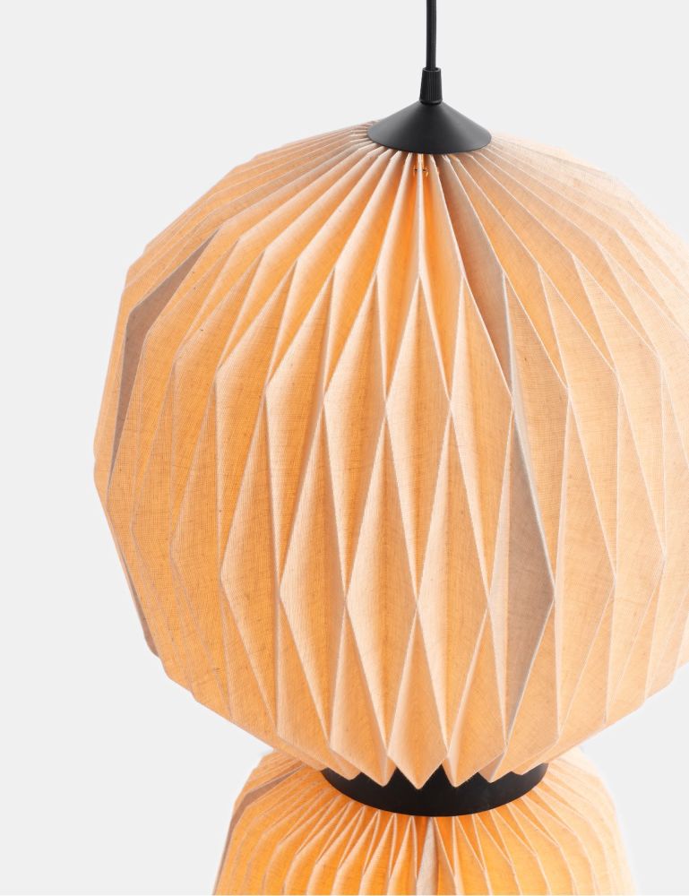COCOmaison is dol op verrassende ontwerpen en dat zie je zeker terug in de Rikke hanglamp. Hij bestaat uit 2 bollen, een grote en een wat kleinere. Beide zijn gemaakt van stevig papier dat als smockwerk gevouwen is. Daarmee krijgt de lamp een origami-achtige uitstraling die helemaal past in de Japandi woonstijl. De hoogte is 77cm en de doorsnede 40cm, maar het is vooral het materiaal dat opvalt. Het papier heeft een naturel kleur en is semi-transparant, zodat de lamp een prachtig gedempt warm licht verspreidt als hij aan is. Maar ook als hij overdag uit is, is het een opvallend design object in huis. De hanglamp bestaat ook in een net iets andere uitvoering die je onderling mooi kunt combineren boven een wat grotere tafel.