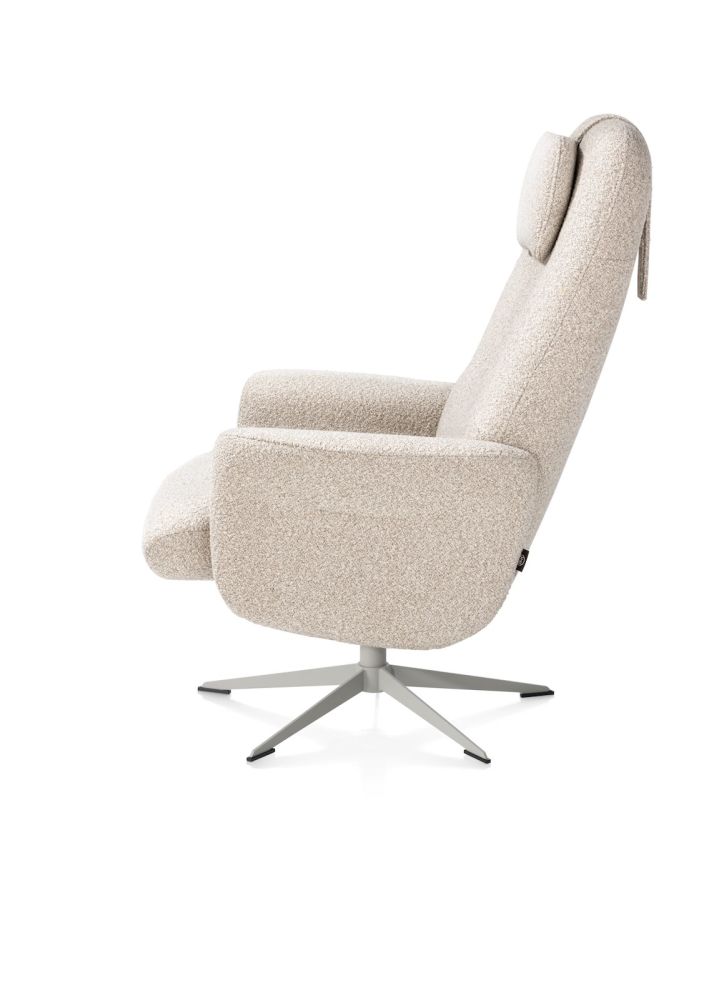 De Torino relaxfauteuil met poef is een comfortabele en stijlvolle aanvulling op je interieur. Deze uitvoering is bekleed met de boucléstof Cloudy in beige, een rustige en zachte tint die warmte en elegantie uitstraalt. De stof is stevig, voelt aangenaam aan en is geschikt voor intensief gebruik. De handmatig verstelbare rugleuning zorgt ervoor dat je de stoel precies naar wens kunt instellen. Het draaibare frame in de kleur silk grey voegt een subtiel en modern accent toe en beschikt over een automatische terugdraaimogelijkheid. Samen met de bijpassende poef biedt Torino het ultieme zitcomfort voor elk moment van de dag.