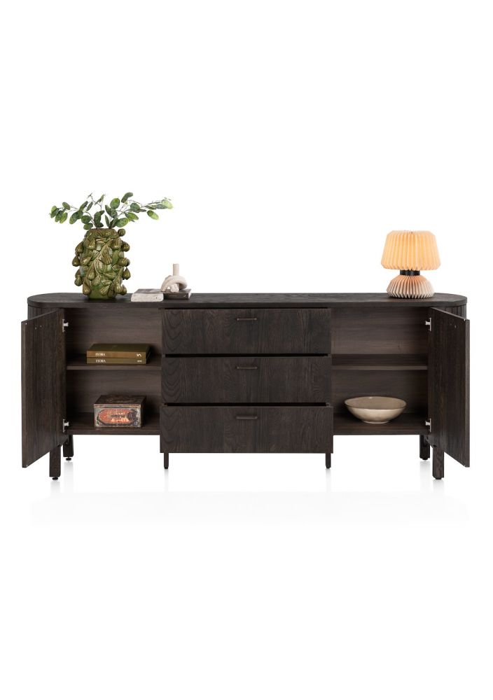 Het Ravello dressoir combineert strak design met warme details. Het eikenfineer in een diepe basaltkleur geeft het meubel een luxe en eigentijdse uitstraling. Voorzien van twee deuren en drie ruime lades met soft close systeem, biedt dit dressoir volop opbergruimte. De platinumlak met matte finish zorgt voor extra bescherming en een stijlvolle afwerking.
