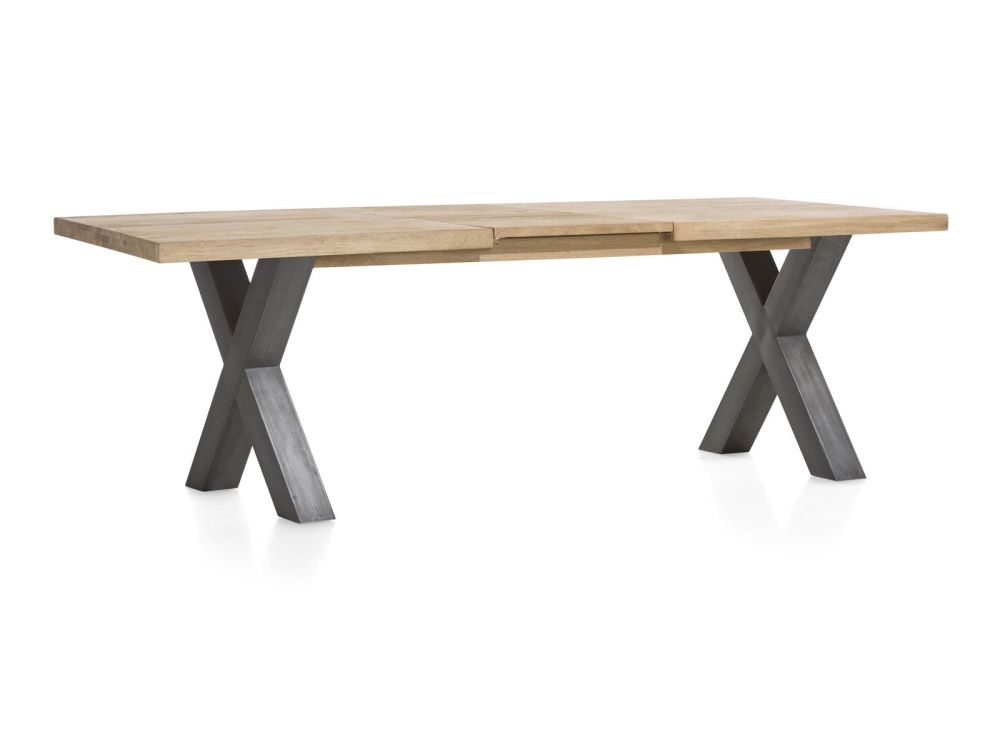 Deze stoere uitschuifbare eetkamertafel uit de Metalox-collectie van Henders & Hazel is 160 x 100 cm. De tafel is eenvoudig te verlengen met 50 cm. Opvallend is het houten tafelblad voorzien van boomschorsrand, dit zorgt voor een robuuste uitstraling. De metalen tafelpoten in X-vorm zorgen voor een modern design. Een fraaie blikvanger in het interieur.