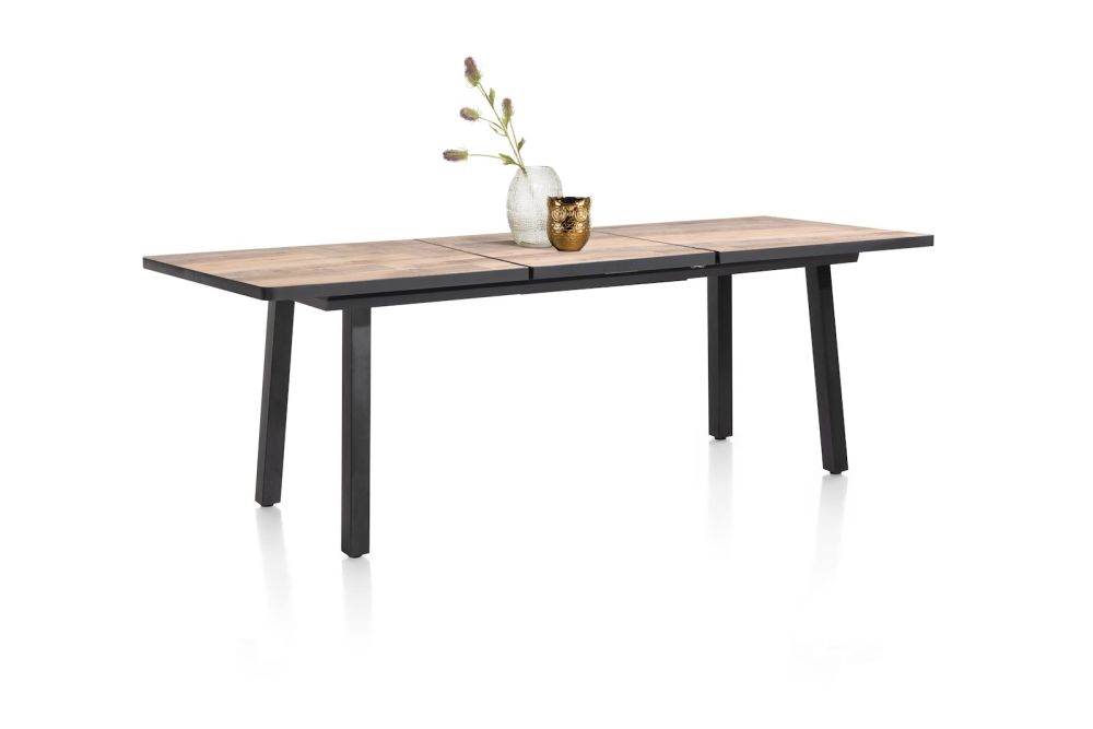Naast de rechthoekige en ovale modellen, biedt de Avalox-collectie ook een praktische uitschuifbare bartafel. Deze uitvoering is beschikbaar in twee formaten; het getoonde model meet 190×98 cm en kan met 60 cm worden verlengd. Het tafelblad is vervaardigd uit Primo Laminato – een stevig en onderhoudsvriendelijk materiaal dat nauwelijks te onderscheiden is van echt hout – en verkrijgbaar in twee warme houttinten: driftwood (afgebeeld) of oak natural vintage. Voor het onderstel kun je kiezen uit twee zwarte metalen opties. Deze variant is uitgerust met vier rechte poten.