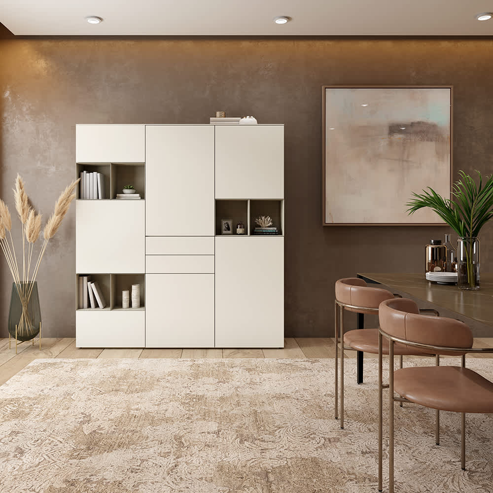 Met het grote aantal elementen, materialen zoals gladde matlak, handgepolijste hoogglanslak, glas, keramiek, mooi natuurlijk eikenhoute of amerikaans noten, 16 standaard lakkleuren worden deze meubelen geheel afgestemd op uw behoeften en smaak.